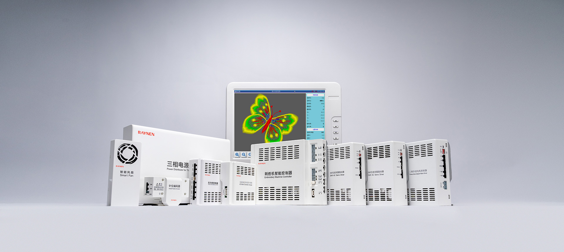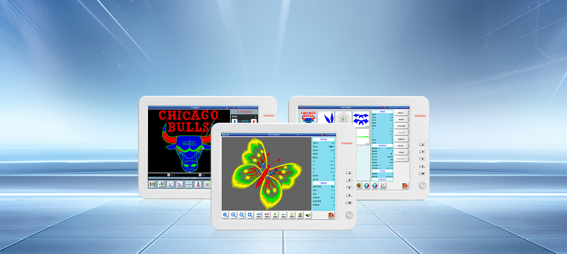 RM系列多頭毛巾繡是屬于一種立體的多工藝刺繡,電控系統(tǒng)通過毛巾主軸M,XY平面框架、D針方向軸、H環(huán)梭軸、S松線軸及T換色軸的6-7個軸綜合控制的數(shù)字控制系統(tǒng)來完成各種各樣花版圖形的鏈式毛巾繡作。在服裝皮革鞋帽等面料上產(chǎn)生出花樣絢麗、立體感強、邊角清晰的繡品。該產(chǎn)品系統(tǒng)嵌入了多種精密加工技術,包括:運動軌跡的跟蹤與控制,花版的綜合顯示管理與預處理,系統(tǒng)多信息融合的協(xié)調控制,各種機械部件的優(yōu)化驅動,管控一體化的調度等。