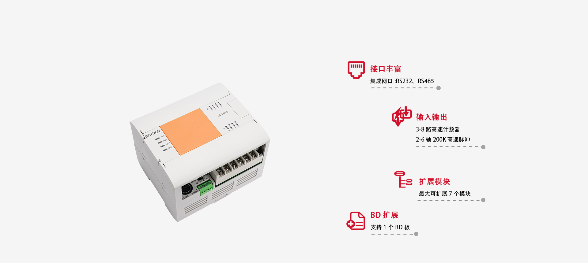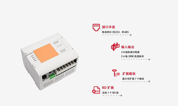 ▲ 具備2-6 軸高速脈沖輸出,高速計數(shù)、直線插補(bǔ)和圓弧插補(bǔ)等運動控制功能